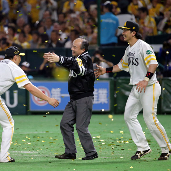 ソフトバンクの孫正義氏(中央)と松田(C)日刊ゲンダイ