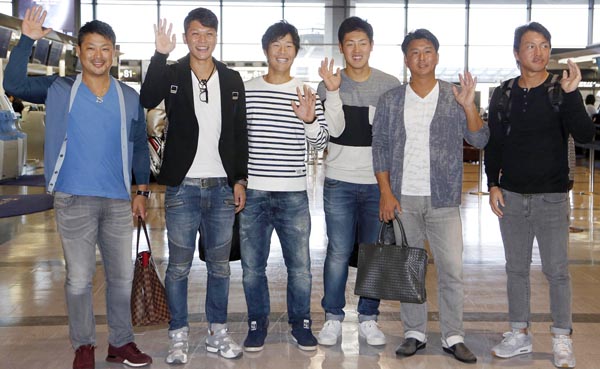 先輩に囲まれ手を振る岡本(右から3人目)/(C)日刊ゲンダイ