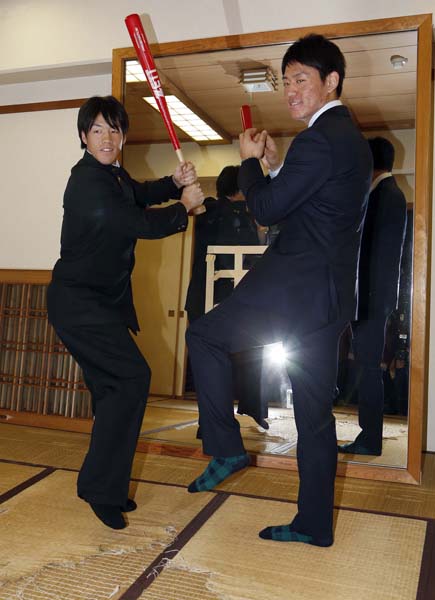かつてはゴジラが素振りした部屋でバッを構える重信(右は1位の桜井)/(C)日刊ゲンダイ