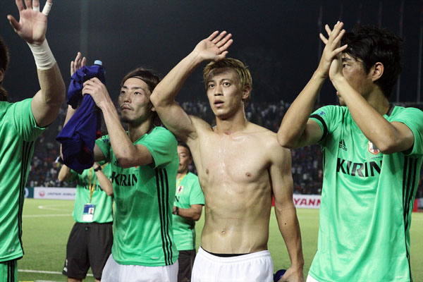 カンボジア戦後にサポーターの声援にこたえる本田(C)六川則夫/ラ・ストラーダ