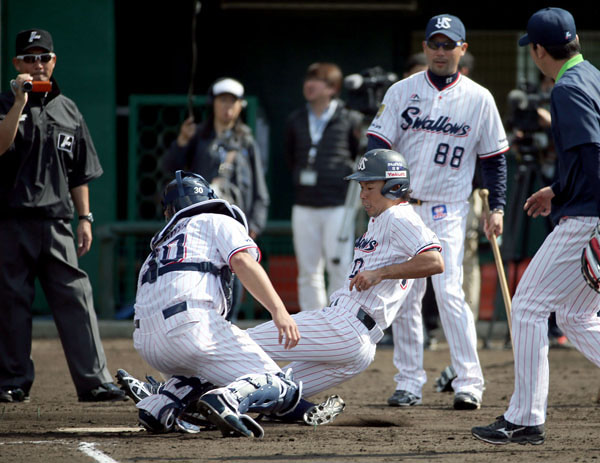 新ルールに沿って本塁クロスプレーを練習するヤクルトナイン(C)日刊ゲンダイ