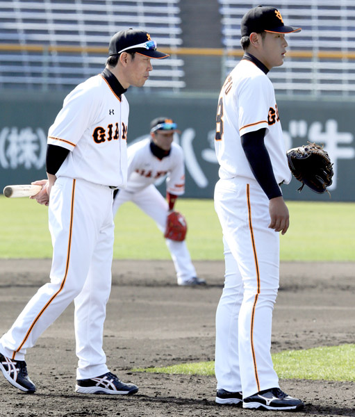 岡本(右)にマンツーマンで指導する井端コーチ(C)日刊ゲンダイ