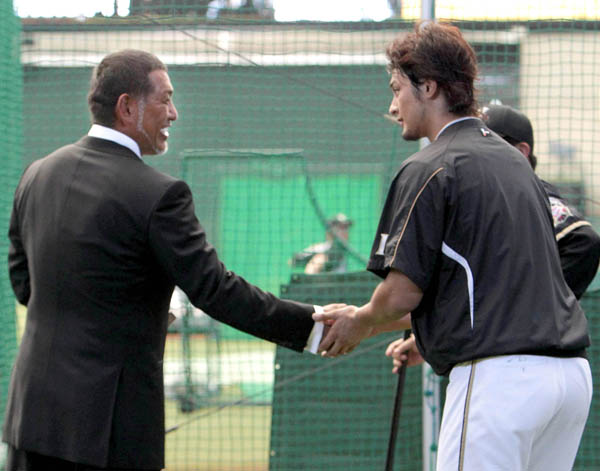 清原と両手で握手する日本ハム時代のダルビッシュ(C)日刊ゲンダイ