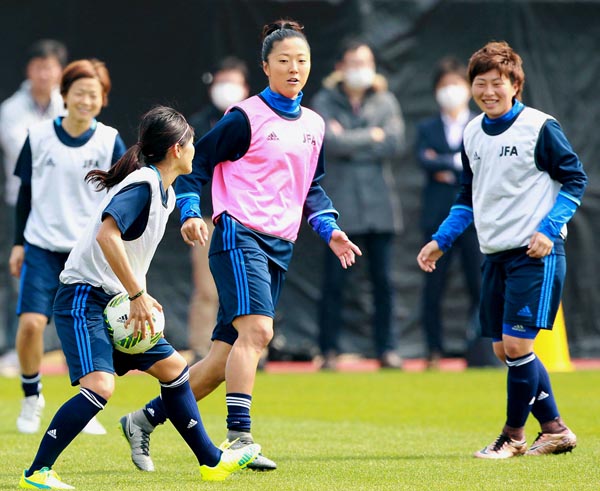 予選敗退決定から一夜明けた8日のなでしこ、報道陣の前ではなごやかムードだが…(C)日刊ゲンダイ