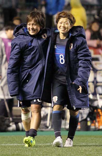 北朝鮮戦で岩渕(左)の得点をアシストした宮間(C)日刊ゲンダイ