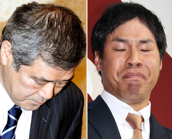 高木京介(右)契約解除会見で頭を下げる久保巨人球団社長(C)日刊ゲンダイ