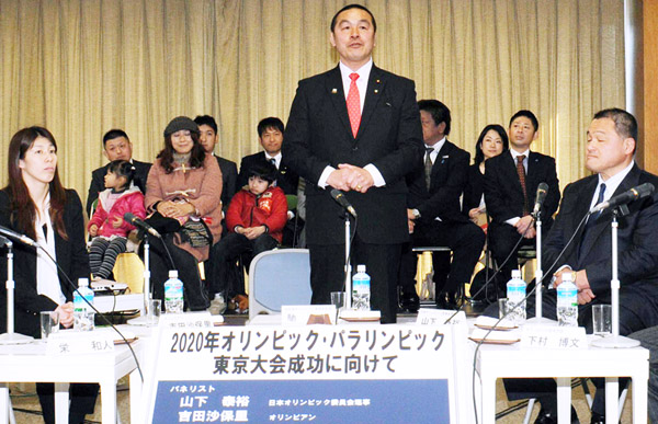 馳文科相(中央)は組み体操を禁止にすべき(両端は吉田沙保里・左と山下泰裕の2氏)/(C)日刊ゲンダイ