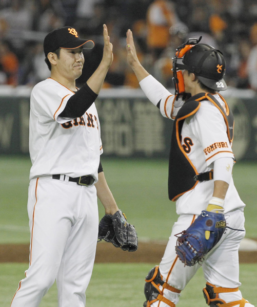 ハイタッチする菅野(左)と小林(C)日刊ゲンダイ