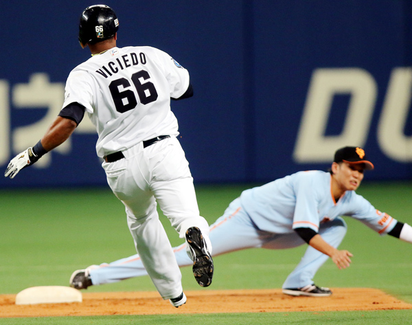六回、坂本(右)がギャレットの悪送球に体を伸ばすが…(C)日刊ゲンダイ
