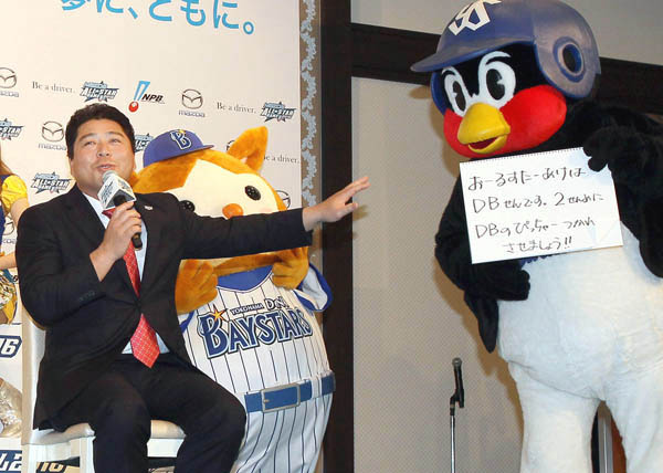突如乱入のつば九郎 セ・リーグ真中監督に“珍提案”