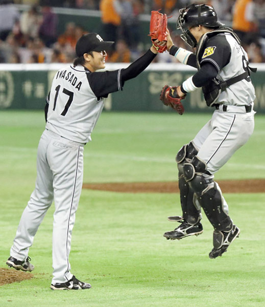 捕手の原田と勝利を喜ぶ岩貞(C)日刊ゲンダイ