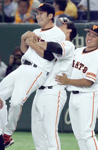 試合終了後、クルーズに持ち上げられ喜ぶ菅野(C)日刊ゲンダイ
