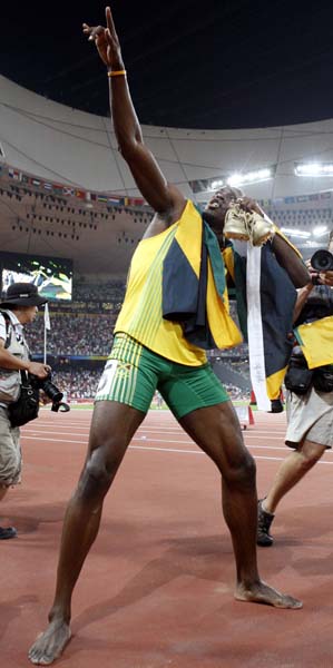 08年北京五輪の4×100Mリレー優勝の後に「ライティング・ボルト」ポーズをするボルト(C)日刊ゲンダイ