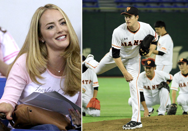 投内連係などで汗を流したマイコラス(右)とローレン夫人(C)日刊ゲンダイ