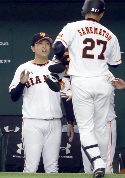 反撃のソロを放った実松を迎える高橋監督(C)日刊ゲンダイ