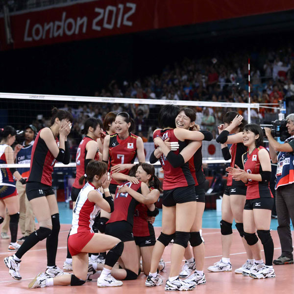 ロンドン五輪3位決定戦で韓国をストレートで破り、28年ぶりの銅メダル獲得を喜ぶ女子バレー日本(C)フォート・キシモト