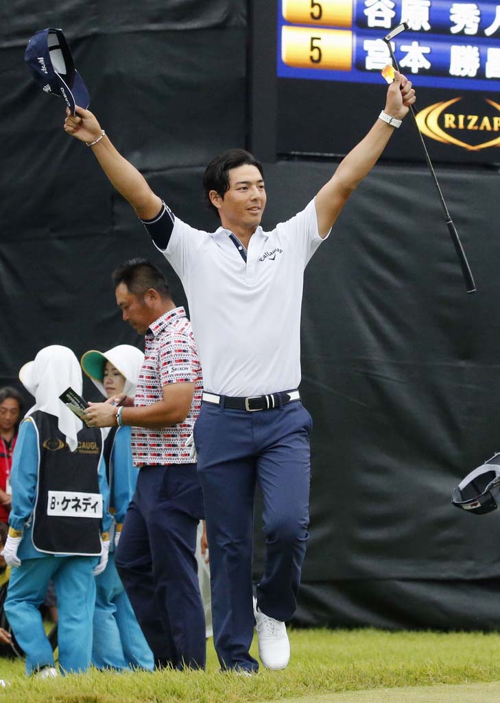 今季初優勝に両手を上げる石川遼(C)共同通信社