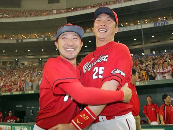 10日の優勝後、新井(右)と抱き合う菊池(C)日刊ゲンダイ