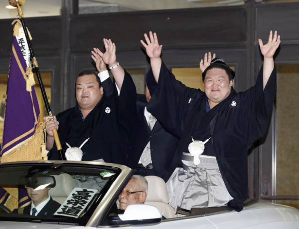 笑顔でパレードする豪栄道(C)日刊ゲンダイ