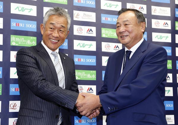 就任会見で居郷球団社長(右)と握手する辻新監督(C)日刊ゲンダイ