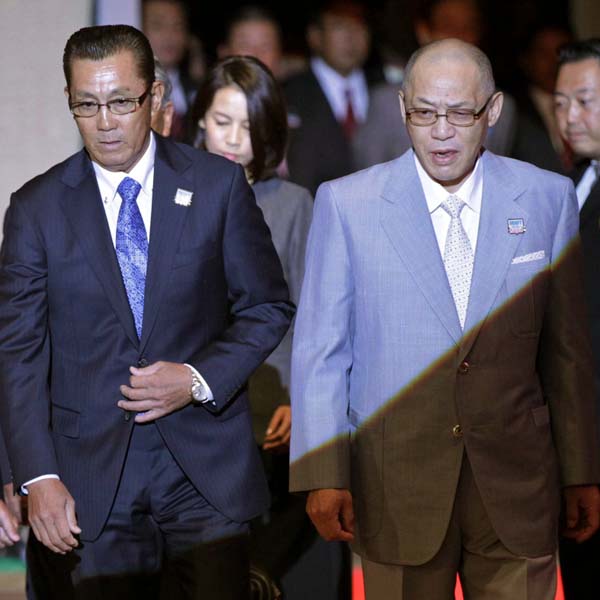 会場入りする森監督(左)と落合GM/(C)日刊ゲンダイ