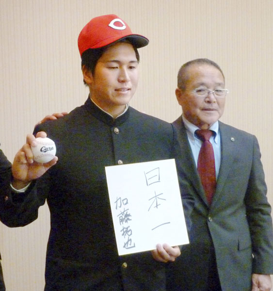 8日に仮契約(右は苑田スカウト統括部長)/(C)共同通信社