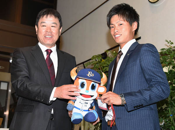 オリックスの福良監督(左)と写真に納まる東京ガスの山岡泰輔(C)共同通信社