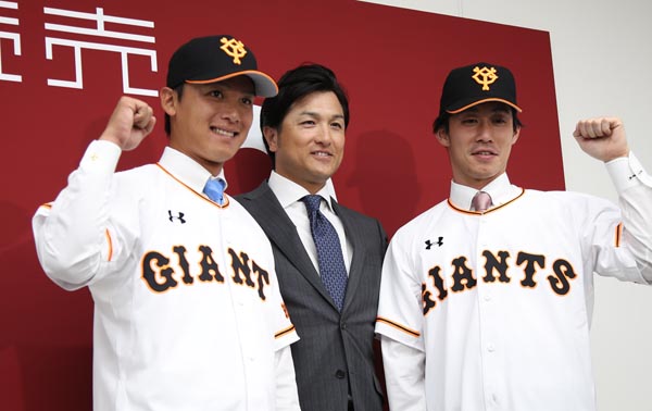 入団発表で活躍を誓った石川(右は吉川)/(C)日刊ゲンダイ