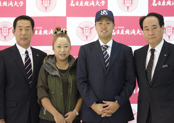 左から中西スカウト担当、美恵さん、中尾、島原チーフスカウト(名古屋経済大学提供)
