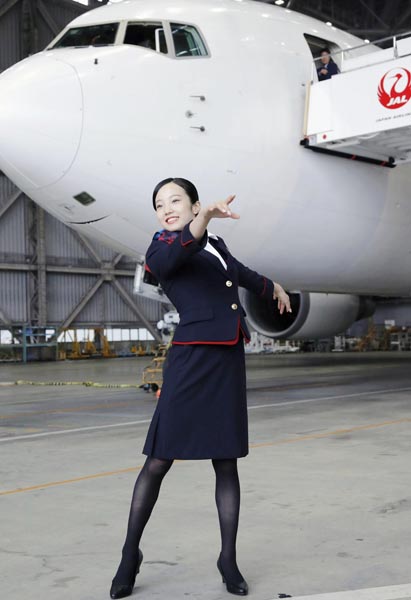 客室乗務員の制服姿でポーズをとる本田真凜(C)共同通信社