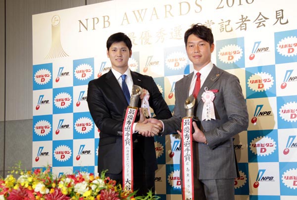 最優秀選手賞を受賞した日本ハム大谷と広島新井(右)/(C)日刊ゲンダイ