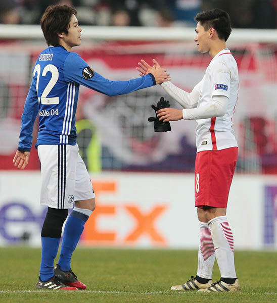 ザルツブルグFW南野(右)と握手する内田(C)Norio ROKUKAWA/office La Strada