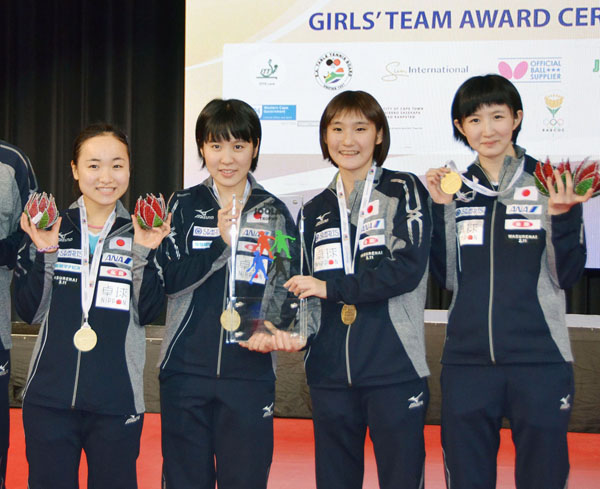(左から)世界ジュニア選手権女子団体で優勝した伊藤美誠、平野美宇、加藤美優、早田ひな(C)共同通信社