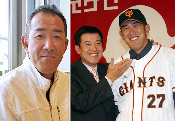 現在の門倉健氏(左)と06年の入団会見で原監督と(C)日刊ゲンダイ