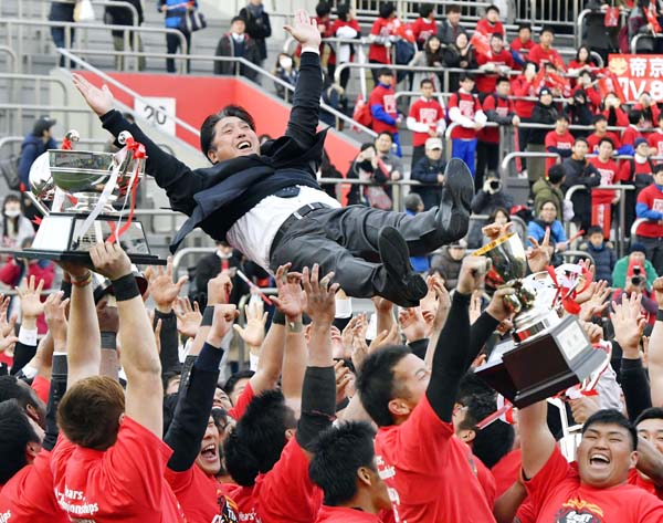 胴上げされる帝京大の岩出監督(C)共同通信社