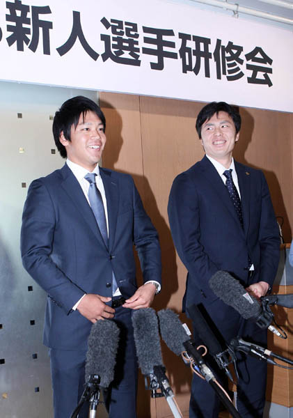 研修を終えた佐々木千隼(左)と田中正義(C)日刊ゲンダイ