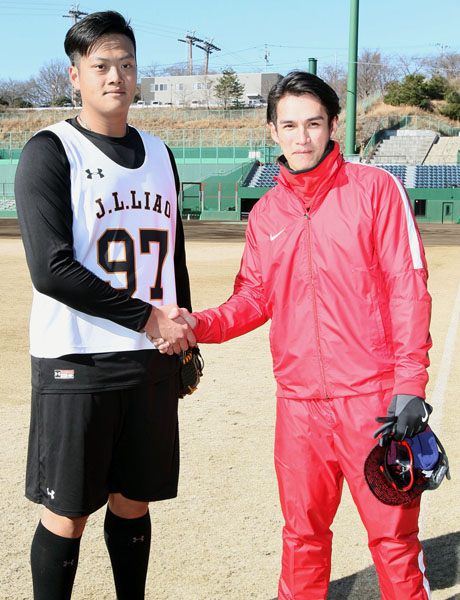 リャオ(左)と握手(C)日刊ゲンダイ