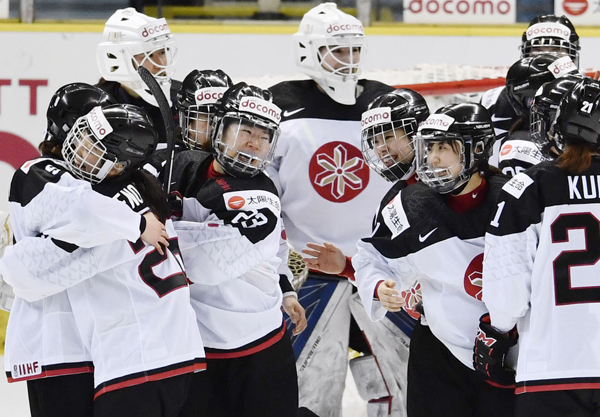 ドイツに勝って喜ぶアイスホッケー女子日本代表(C)共同通信社