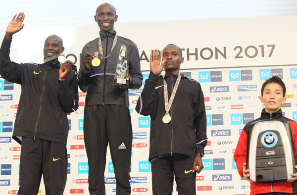 優勝したキプサング(中央)の賞金は1100万円、日本人トップの井上はBMWを貰った(C)日刊ゲンダイ