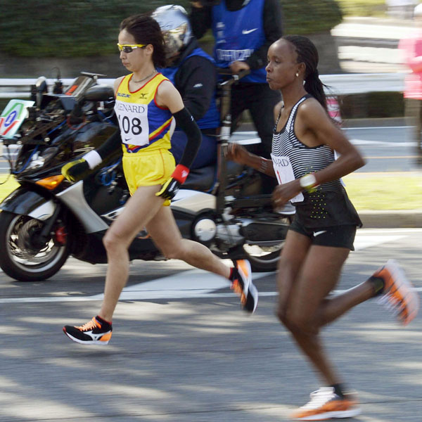 25キロすぎでトップを争う安藤(左)とキルワ(C)共同通信社