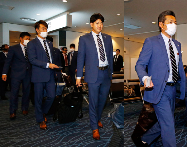 米国入りした小久保監督(右)と菅野ら/(C)日刊ゲンダイ