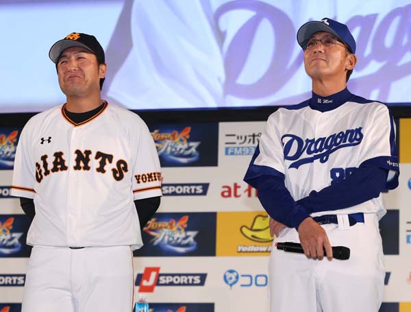 中日・森監督(右)の隣で微妙な表情を浮かべる巨人・高橋監督/(C)日刊ゲンダイ