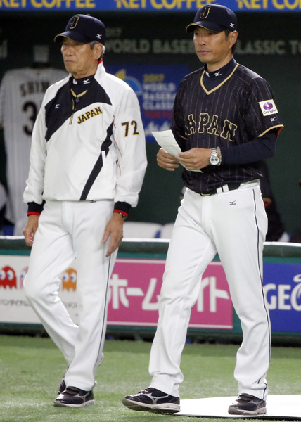 投手交代で小久保監督(右)とベンチを出る(C)日刊ゲンダイ