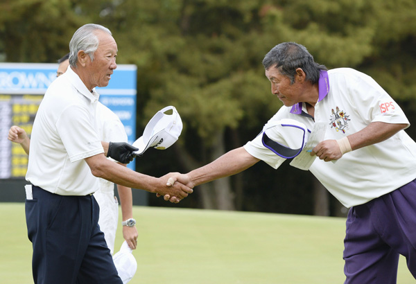 ツアー史上最年長出場記録を更新した青木功(左)とジャンボ尾崎/(C)共同通信社