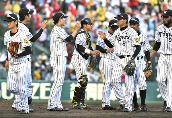 逆転勝利でタッチを交わす阪神ナイン(C)共同通信社