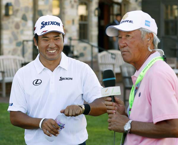 80年全米OP2位の青木功氏にマイクを向けられ笑顔(C)共同通信社