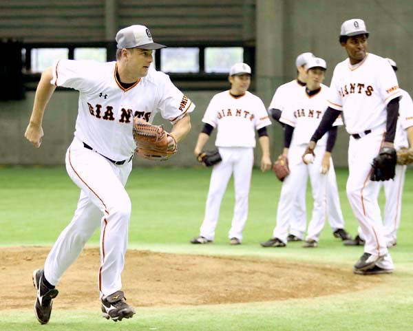 投内連係で汗を流すマシソン(左)/(C)日刊ゲンダイ