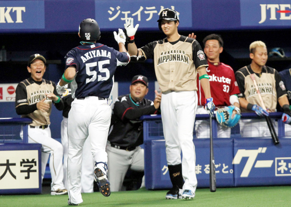 先頭アーチの西武・秋山を出迎える日本ハム大谷(C)日刊ゲンダイ