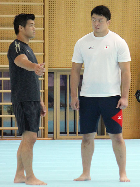 100キロ超級でリオ五輪銅メダルの原沢と話をする井上監督(左)/(C)日刊ゲンダイ