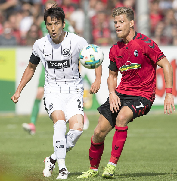 フライブルク戦の前半にパスを出す長谷部(C)共同通信社